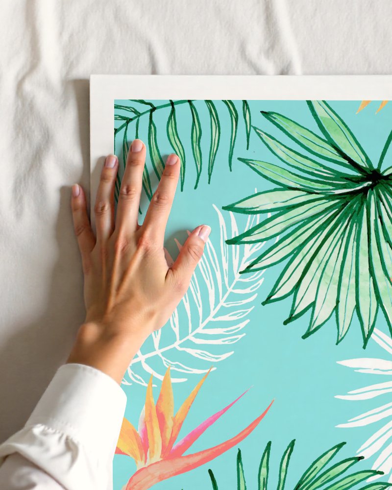 Sun-soaked vibes, wherever you go — this tropical pattern bursts with lush palm leaves and bold bird-of-paradise blooms, set against a refreshing aqua blue background. Hand-painted in watercolor textures, it radiates laid-back island charm with a modern, joyful twist. Perfect for brightening up your phone case, wall, or wardrobe—this design brings an instant dose of vacation energy.