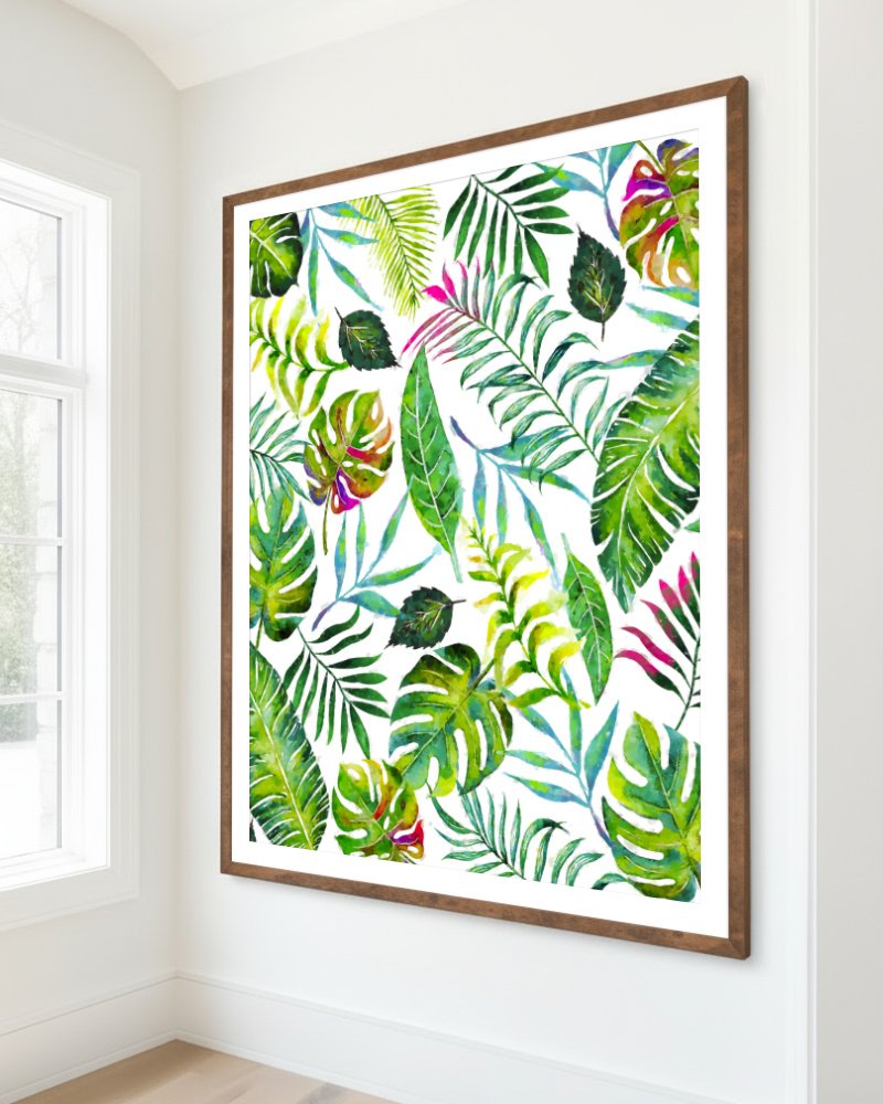 Set against a crisp white background, the vivid greens truly come alive, making this a perfect statement piece to instantly transform any space into a sunny, exotic sanctuary.