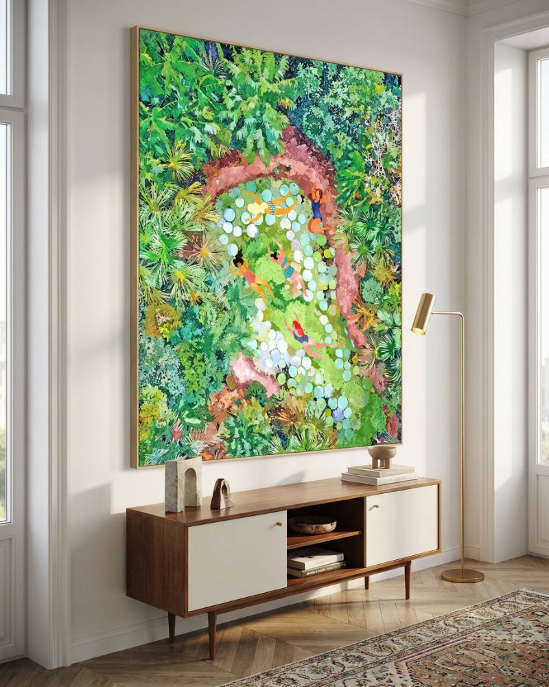 Escape into a whimsical world of lush greenery and joyful connection with Tropical Vacay. This vibrant aerial-style artwork captures a playful group of women floating and relaxing in a jungle-inspired natural pool, surrounded by layers of rich tropical foliage. With its painterly textures and saturated greens, this piece evokes the ultimate slow-living dream — carefree, barefoot, and surrounded by nature.