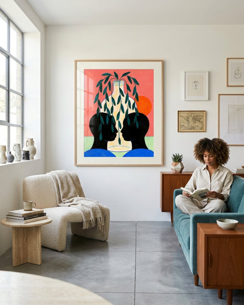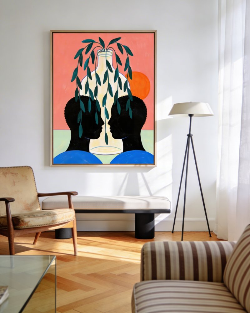 Two mirrored silhouettes stand face to face, held within a shared vessel — where what is contained begins to grow. Leaves spill downward like unspoken thoughts taking root, while a rising sun burns quietly in the background. Unbottle is about release — the courage to open, to soften, to let what lives inside expand beyond its edges. A striking statement piece for spaces that honor depth, duality, and the power of emotional expression.