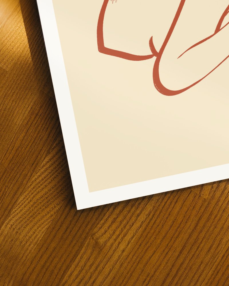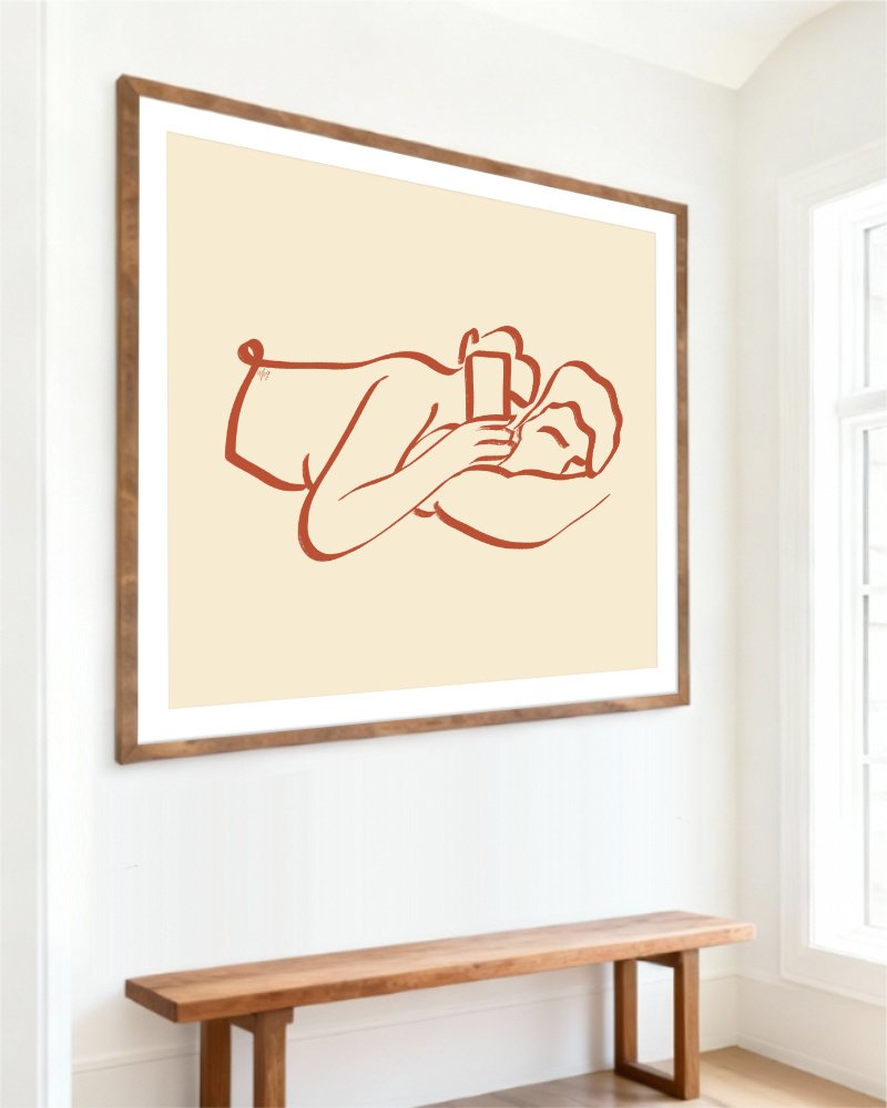 The restrained palette and open negative space give the artwork a sense of calm and intimacy, making it easy to live with while remaining emotionally present. It invites the viewer to slow down, to recognize the beauty of closeness without performance — a moment that exists just for itself.