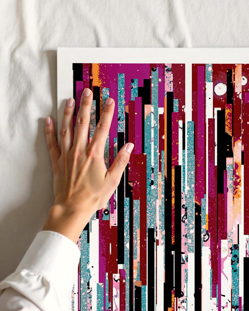 Featuring a dynamic composition of vertical lines in rich hues of magenta, teal, black, and white, this piece is a celebration of color and texture. The intricate layering and splashes of detail create a sense of movement and depth, making it a captivating focal point. This artwork is perfect for modern design, adding energy and sophistication making a bold statement.