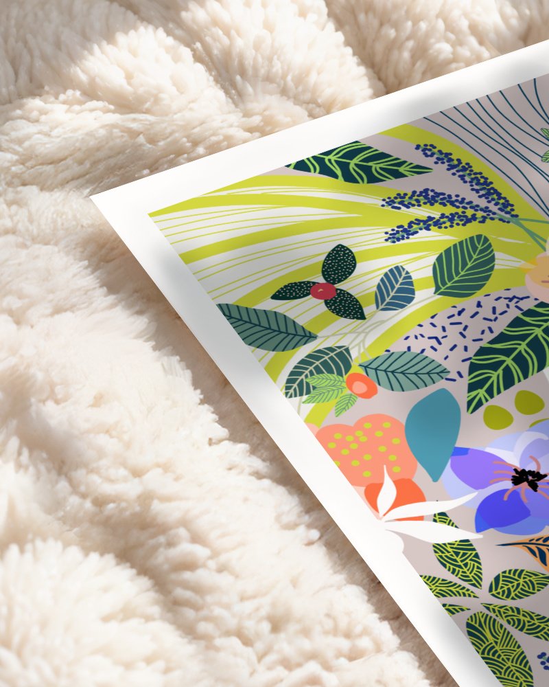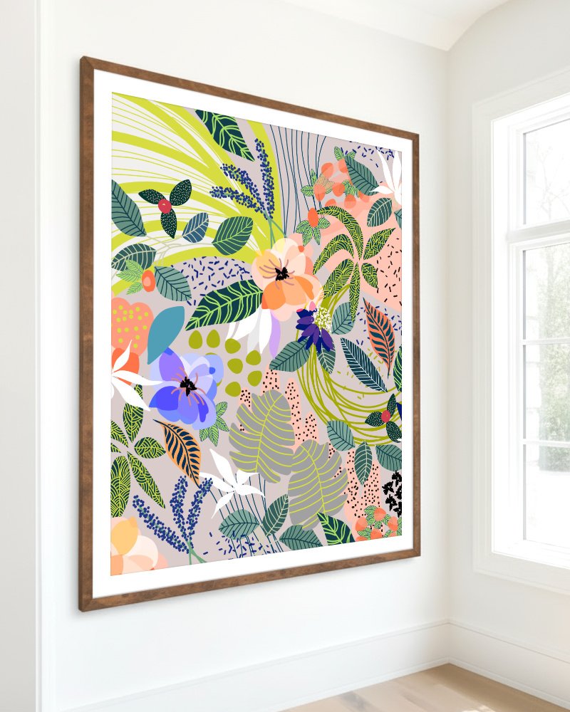 Featuring an explosion of colors, intricate leafy patterns, and beautifully stylized flowers, this artwork brings nature indoors with a modern, playful edge. The mix of vibrant greens, soft pastels, and bold blues creates a harmonious and lively composition that will brighten any space or creative project.