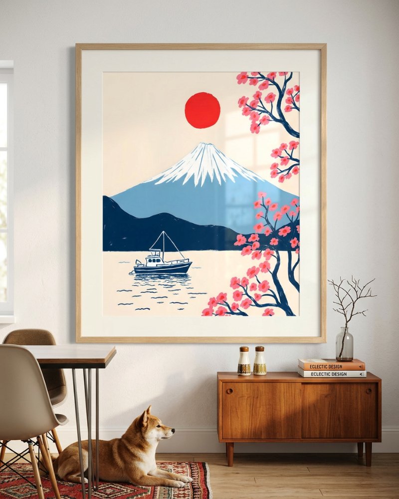 Made to live with you — not just hang on your wall. For spaces that want to feel alive, not just styled.Bring the peaceful beauty of Japan into your home with this vibrant landscape art print featuring a snow-capped mountain, glowing red sun, and delicate cherry blossoms. Inspired by traditional Japanese aesthetics, this artwork blends calming minimalist design with bold, modern color. The tranquil boat on shimmering water adds a sense of wanderlust and serenity, making it perfect for living rooms, bedrooms, home offices, or meditation spaces. Ideal for collectors who love Japanese wall art, travel art prints, cherry blossom décor, or modern minimal landscapes—this piece adds harmony, warmth, and timeless style to any interior.