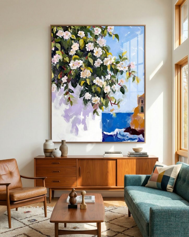 Made to live with you — not just hang on your wall. For spaces that want to feel alive, not just styled.“Where The Blossoms Meet The Sea” is an expressive, painterly tribute to the effortless romance of a Mediterranean afternoon. This piece focuses on the beautiful interplay between nature and light, featuring heavy, cascading branches of jasmine or white jasmine, their petals catching the sun against a luminous, pastel sky. The composition is framed by these lush, fragrant blossoms, leading the eye down to a tranquil vignette: a lone sailboat on electric blue waves and a traditional stone villa perched atop a sun-baked cliff.