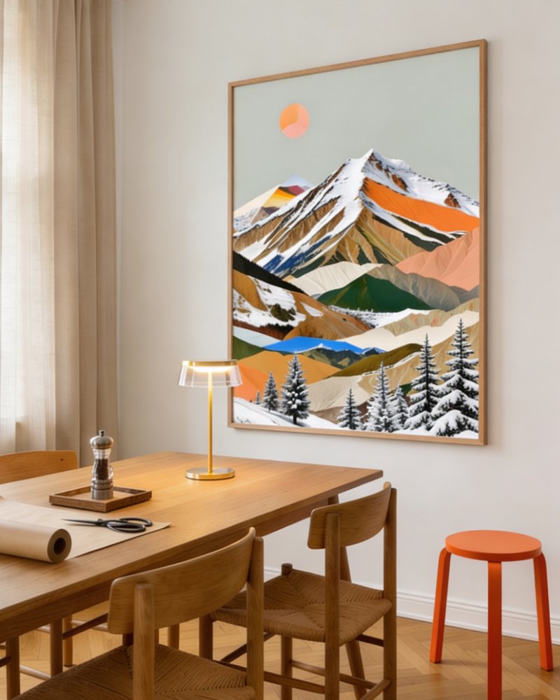 Say Hi to this stunning artwork that intricately blends layers of bold textures and soft pastel hues to create a mesmerizing snowcap mountain landscape. This captivating collage captures the serenity and majesty of nature, inviting viewers into a world where rugged peaks meet gentle skies leaving a lasting impression. Each element of the piece is thoughtfully curated, combining fabric swatches, textured paper, and delicate paint strokes that evoke the feeling of climbing through mist-covered valleys and reaching for the sky.