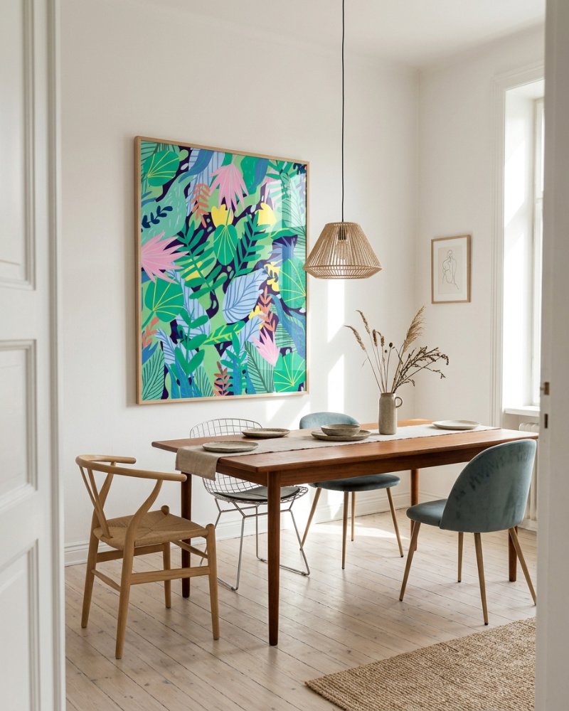 Made to live with you — not just hang on your wall. For spaces that want to feel alive, not just styled.“Wild Garden” is an energetic exploration of a fantastical, neo-tropical jungle. This piece reimagines natural forms with an idealized, hyper-saturated palette, where traditional greens are amplified by electric teals and sharp yellows. The true heartbeat of the composition, however, is the joyful rhythm of the stylized pink palm fronds and the subtle coral-orange ferns that puncture the dense foliage. This tension between a deep, inky indigo background and a foreground of vivid, playful life celebrates nature’s relentless energy and unpredictable beauty.
