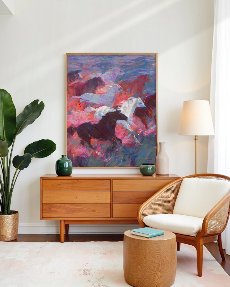 This striking abstract horse artwork showcases powerful running horses set within a vivid swirl of magenta, plum, teal, and warm sunset hues. Textured layers and fluid brushwork create a sense of unstoppable motion, giving the piece an energetic, almost mythical atmosphere. Ideal for collectors of equine art, modern abstract prints, and bold statement décor, this painting brings movement, color, and emotional depth to any room. Perfect for living spaces, creative studios, or office walls, it adds a captivating, free-spirited elegance to contemporary interiors.